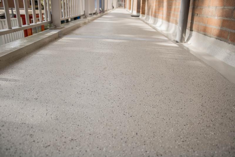 In Nieuwegein zijn de galerijen van zes flats gerenoveerd door Grandia Betonherstel BV uit Asperen. “Voor dit project werkten wij met het vloersysteem Quartzline Protect Fast Cure. Polyaspartic wordt in de zandlaag en toplaag gebruikt. Dit hecht goed op verschillende ondergronden, het is goed antislip te maken, fijn verwerkbaar en het is geurloos. Een pluspunt van Quartzline want onderschat dit laatste niet. Vele producten stinken gewoonweg en dat is uiterst onprettig om mee te werken, niet alleen voor ons maar ook voor de omgeving,” zo vertelt Ludwig Grandia. Het karwei omvatte zo’n 2000 m2. Eerst werden de toplagen verwijderd en de diktekanten en schopranden hersteld en gecoat. Na de renovatie van de vloeren werd nog een antislip-coating aangebracht.